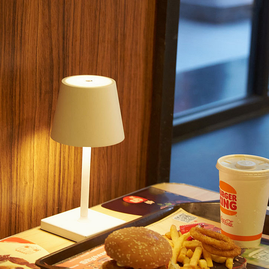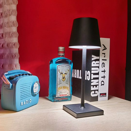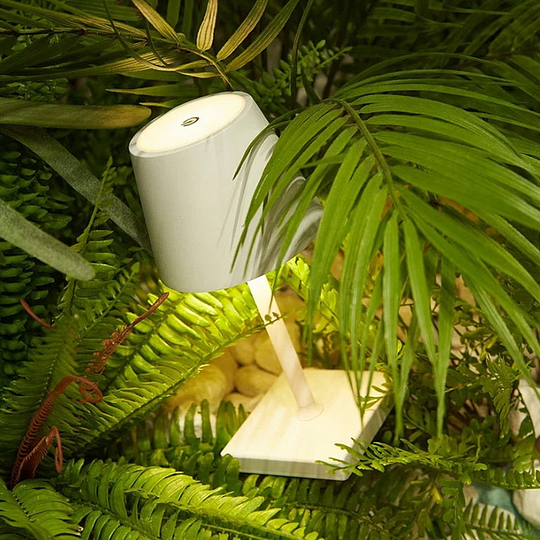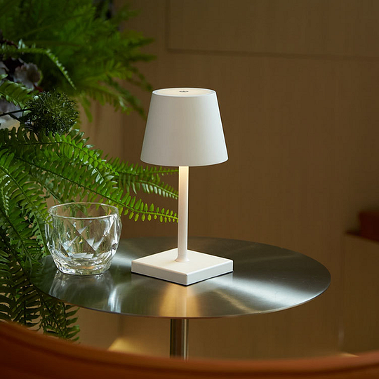 The rechargeable table lamp is in painted aluminum, polycarbonate diffuser, and LED light source. The non-slip mat is wear-resistant, effectively reducing the friction between the base and the desktop.