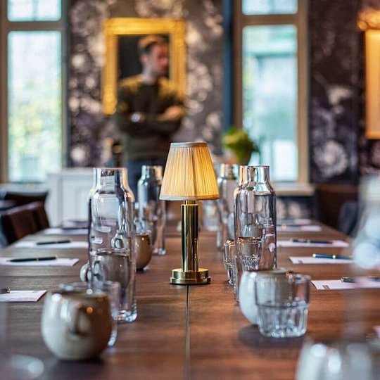 It is a slim, refined cordless table lamp that provides direct downlight and soft diffused sidelight. Hot forged from a single ingot of raw brass, the lamp's body is CNC machined, polished, and lacquered for long-lasting, deep luster.