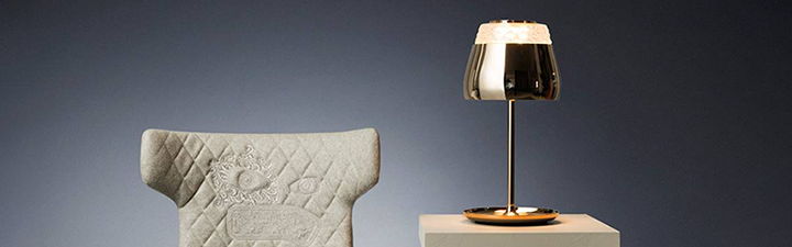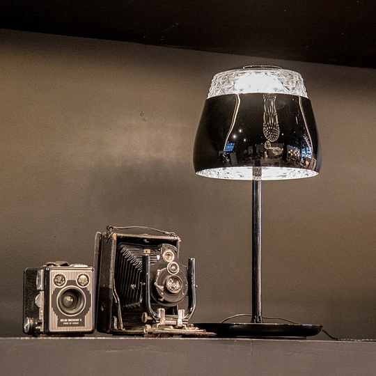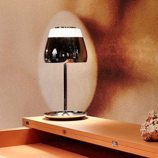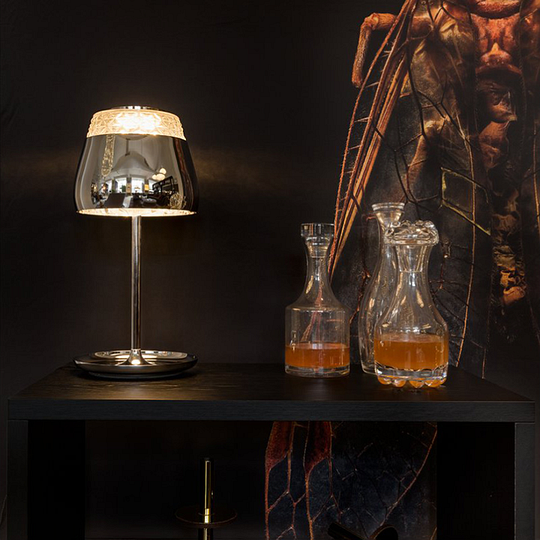 This florid table lamp is an inventive and romantic fixture, which lends a magically lit effect, diffused via a blown-glass, crystal-topped metal shade, which further reflects off the mirrored surface inside.