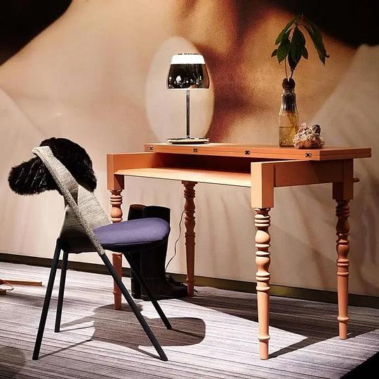 The tray-shaped base doubles up as key, wallet, or trinket-holder. The curved base is all-encompassing, particularly useful for bedside, which is mirrored, reflecting an endlessly bouquet of flowers.