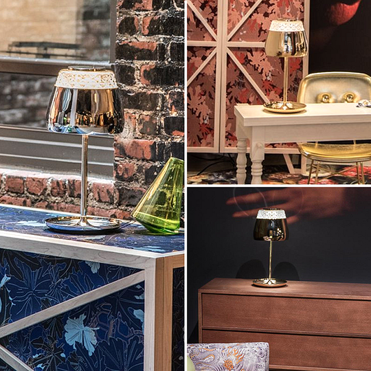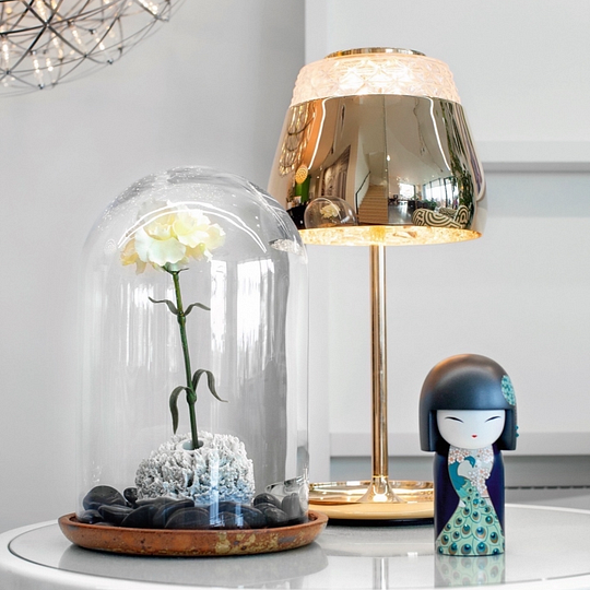 A magic mirror and the power of crystals transforms a simple shell into an endless light bouquet of flowers. This metallic lacquered table lamp will create an endless enchanting light source.